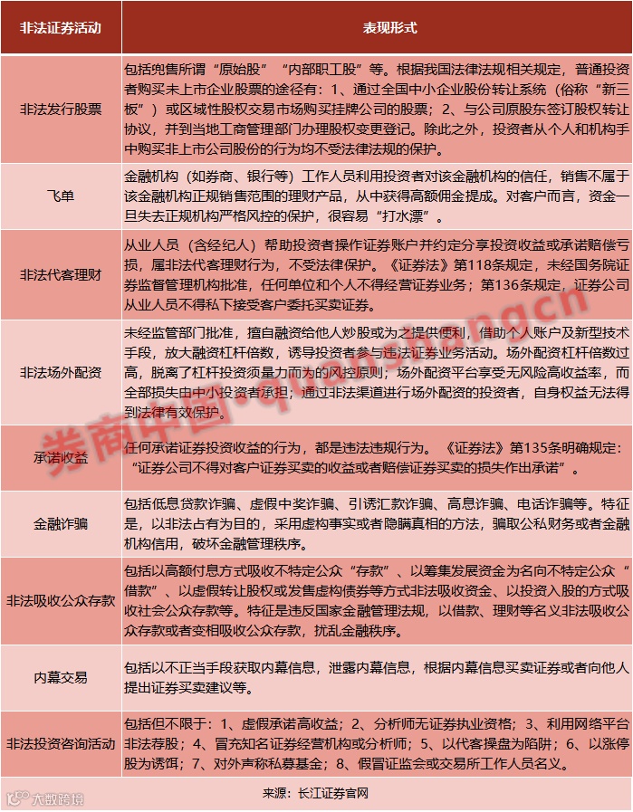 记者注意到,近日长江证券收集整理了市场上不断翻新的非法证券活动,包括非法发行股票、飞单、非法场外配资等等。长江证券还提醒投资者明辨真伪,远离非法证券活动。