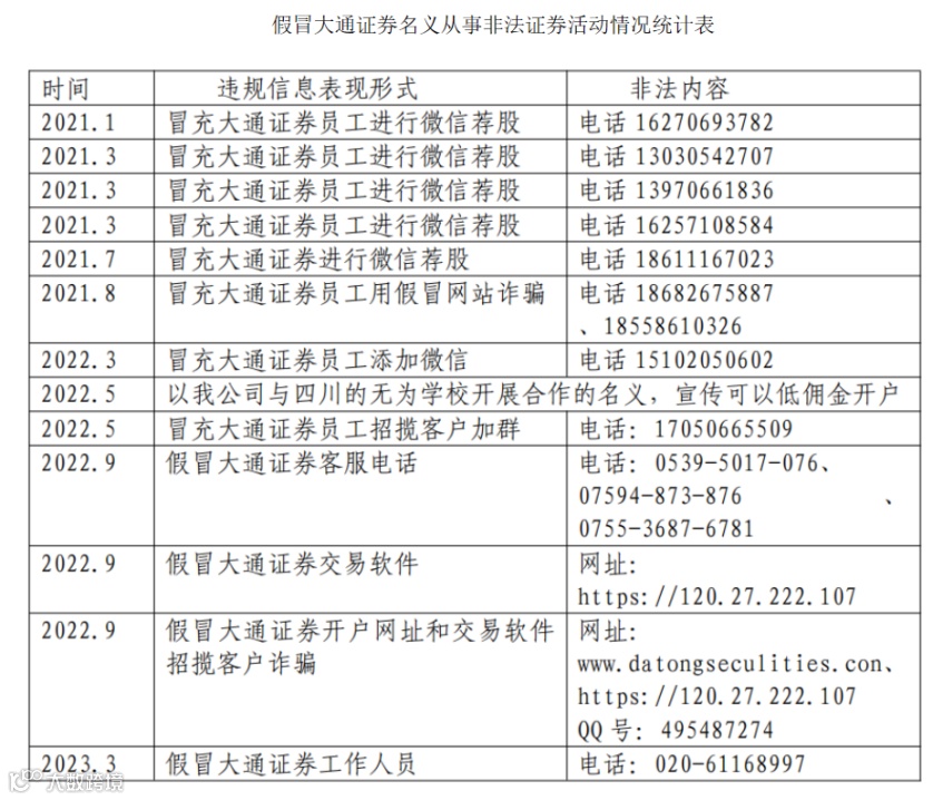 此外,大通证券近日也在官网公告称,公司发现,有不法人员假冒公司名义拨打电话联系投资者(不法电话:020-61168997),疑似从事非法证券活动。