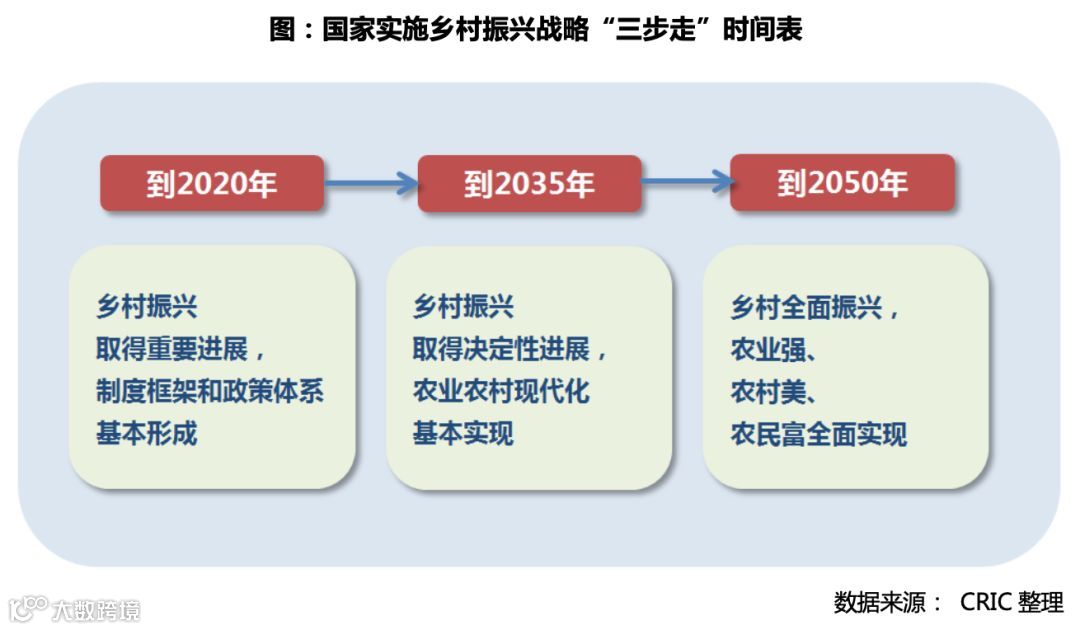 综上,对于整体房地产行业而言,乡村振兴工作在未来的很长一段时间内将是大有可为的发展领域,探索新的参与方式与经营模式也是企业的一大重要任务。根据乡村振兴战略“三步走”时间表,从2018年战略实施到2020年实现乡村全面振兴,农村强、农村美、农村富的全面实现需要30余年的规划周期。当前国家乡村振兴战略尚处在政策起步期,对于房企而言,乡村振兴工作任重而道远。