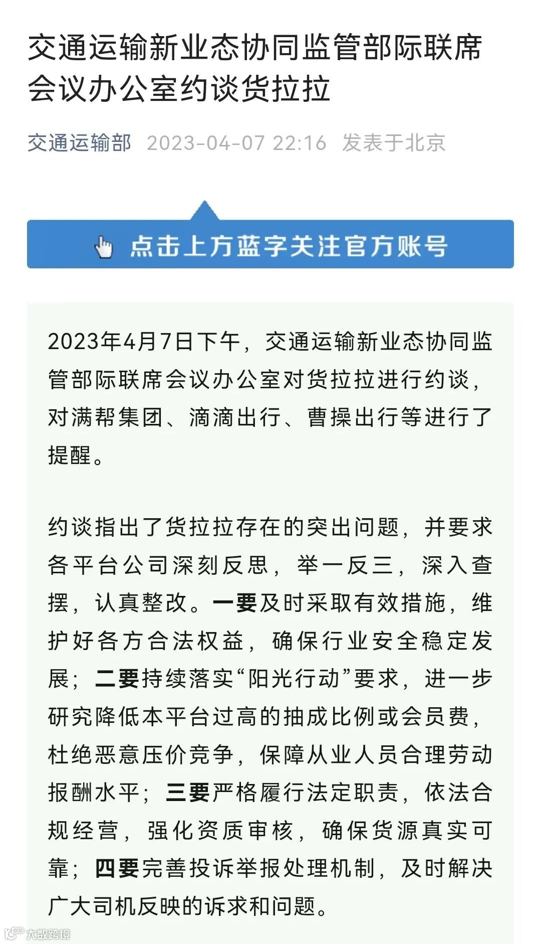 据交通运输部微信公众号4月7日消息,2023年4月7日下午,交通运输新业态协同监管部际联席会议办公室对货拉拉进行约谈,对满帮集团、滴滴出行、曹操出行等进行了提醒。