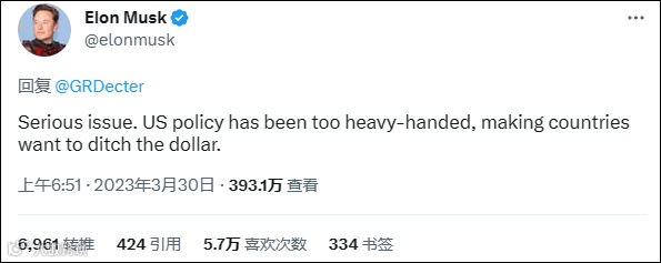 另外,当地时间3月30日,特斯拉首席执行官埃隆·马斯克(Elon Musk)在推特上发表评论称,这是一个严重的问题,美国的政策过于强硬,使得各国都想要抛弃美元。
