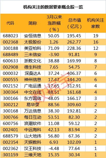 部分数据要素概念股获得机构密切关注。数据宝统计,8股获得5家以上机构评级,安恒信息、太极股份、美亚柏科评级家数居前,分别为19家、16家、12家。
