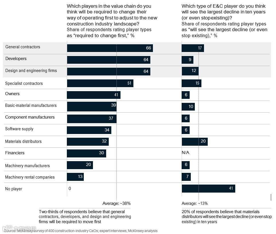 四个领域的公司将面临最大的长期衰退:材料分销商、综合承包商、专业承包商以及设计和工程公司。这些公司可能面临商品化以及价值份额的下降。此外,受访者认为总承包商将会率先进行转型。