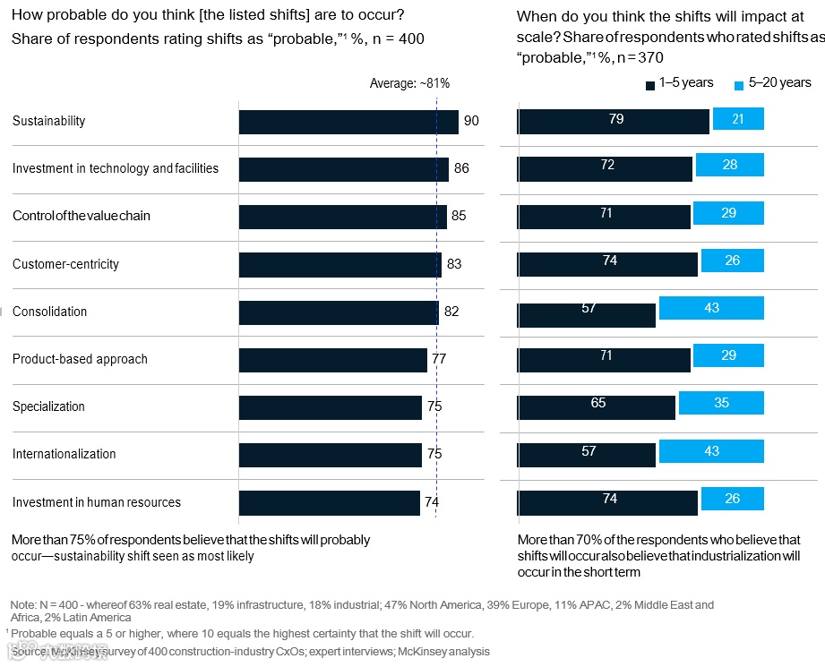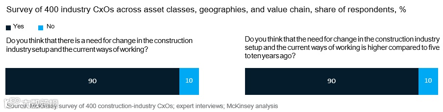 迄今为止,更广泛的行业反应一直是维持现状,这是建筑公司面临上述许多挑战的根源。然而,高管们认识到适应的必要性。麦肯锡通过对建筑行业内400位CxOs调查发现,90%的受访者强烈认为该行业需要改变——而且这种需求在过去十年中有所增加。