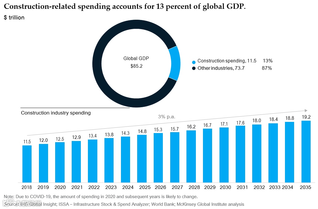 建筑相关支出占全球GDP的13%,然而,在过去的几十年里,它一直受到生产率增长滞后、数字化有限、破产频繁和客户满意度低的困扰。落后的生产力增长,使得行业的全球劳动生产率年增不到1%,远低于全球经济生产率年增长的2.8%。数字化、标准化程度低,新技术发展缓慢,尽管业绩增长强劲,但利润低、风险高。