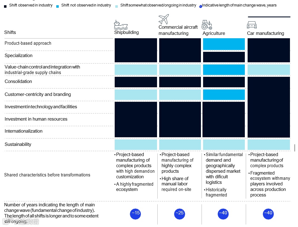 类似行业的转型历程花了几十年才完成。受访者表示,建筑业的转变将出现两波主要浪潮,类似于在这些行业观察到的转型历程。在第一波浪潮中,工业化将使过程标准化,提高部门生产率。第二波浪潮将聚焦于规模,参与者将专注于最终用途领域,在价值链上进行垂直整合,并进行国际扩张。通过吸收其他行业转型历程中的教训,建筑公司可以开始为即将到来的剧变做好准备。