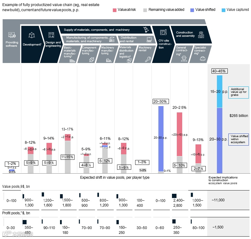 未来15年,随着价值和利润池的转移,该行业的转型将创造巨大的机遇和巨大的风险。在过去的几年中,大约有11万亿美元的增加值和1.5万亿美元的利润在建筑价值链和所有资产类别中不均衡地分配。
