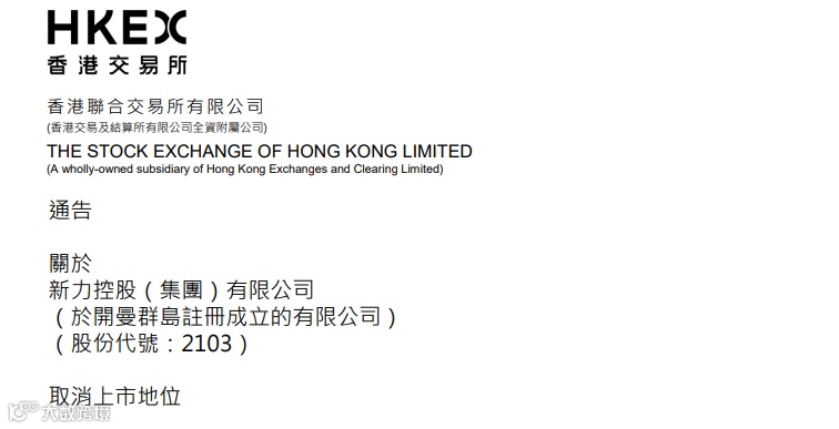 公告称,新力控股的股份自2021年9月20日起已暂停买卖。根据《上市规则》第6.01A(1)条,若该公司未能于2023年3月19日或之前复牌,联交所可将该公司除牌。该公司未能于2023年3月19日或之前履行联交所订下的复牌指引而复牌。于2023年3月24日,上市委员会决定根据《上市规则》第6.01A(1)条取消该公司股份在联交所的上市地位。