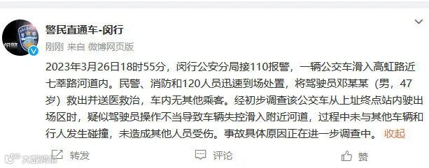26日晚间,@警民直通车-闵行发布通报称:2023年3月26日18时55分,闵行公安分局接110报警,一辆公交车滑入高虹路近七莘路河道内。民警、消防和120人员迅速到场处置,将驾驶员邓某某(男,47岁)救出并送医救治,车内无其他乘客。