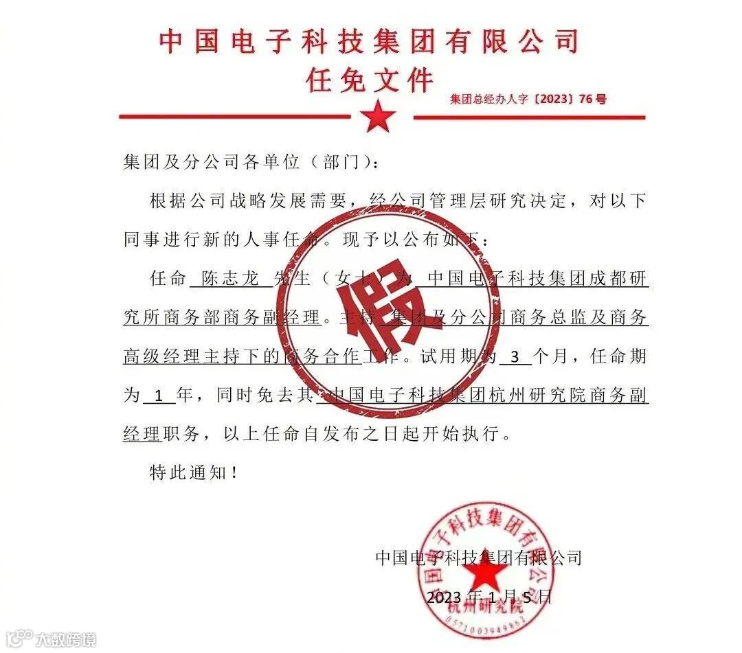 新华网记者从中国电科成都多家单位获悉,网上有关“中国电科陈志龙”的信息,均为虚假信息。集团公司所有单位已经开展了多轮次排查,包括劳务派遣和协作人员,均无此人。网上出现的任免文件明显伪造。中国电科相关单位已报案。