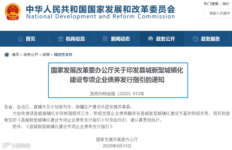 8月26日,为充分发挥企业债券融资对县城新型城镇化建设的积极作用,国家发展改革委发布了《县城新型城镇化建设专项企业债券发行指引》(发改办财金规〔2020〕613号)(简称《指引》),明确了专项企业债券发行的适用范围、支持重点和发行条件等。