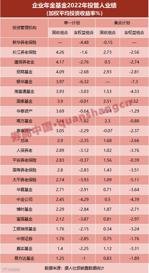 整体上,22家投管人管理的单一计划的固收组合、含权益组合的2022年的平均收益率分别为2.9%、-2.35%,集合计划的固收组合收益率为1.68%、含权益组合收益为-2.66%。