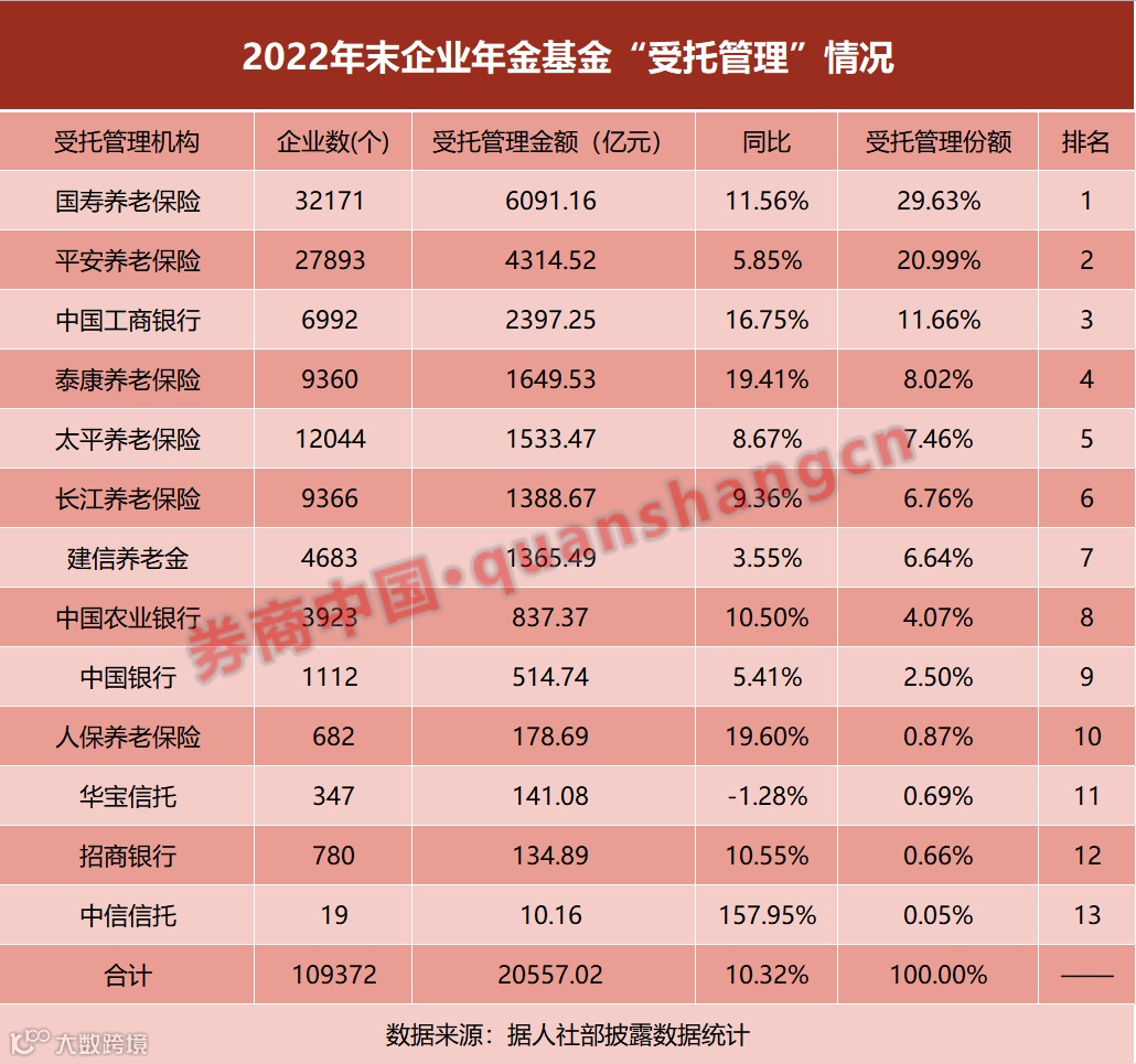 企业年金相关的另一重要业务为受托管理。多年来具有企业年金基金法人受托机构资格的有13家,2021年人社部对华宝信托不予延续企业年金受托资格,受托管理机构减少至12家,包括6家保险机构、4家银行、1家养老金公司、1家信托公司。2022年末,连同华宝信托在内合计受托管理资产2.05万亿元,同比增长10.3%。