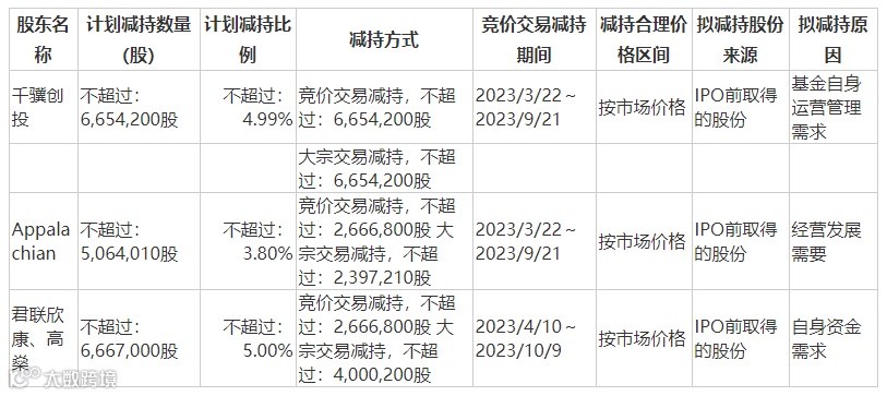 具体来看,千骥创投、Appalachian拟进行“清仓式”减持,减持股数分别不超过665.42万股、506.4万股;君联欣康和高燊拟合计减持不超过666.7万股,3家机构股东合计减持比例不超过公司总股本的13.79%。在本次减持完成后,千骥创投、Appalachian不再持有公司股份,君联欣康和高燊持股比例降至1.57%。