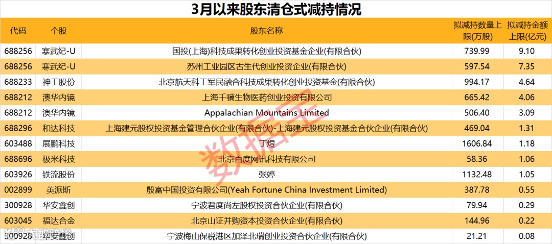 寒武纪-U的两位股东拟“清仓式”减持,且减持金额上限居前,合计16.45亿元。两位个人股东选择大手笔清仓,丁煜减持展鹏科技1606.84万股,张婷减持铁流股份1132.48万股。