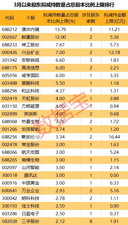 证券时报·数据宝统计,3月以来,除去已减持完成的情况,共计109名股东抛出减持计划,涉及上市公司69家。以减持上限及公告日收盘价计算,合计拟减持金额149.27亿元。