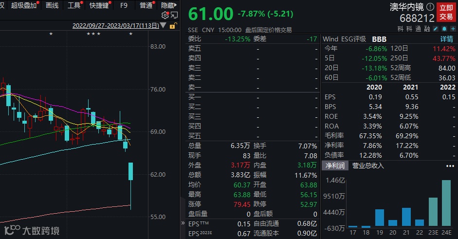今日,国产软镜龙头澳华内镜开盘后股价跳水,一度跌逾13%。截至收盘,该股跌幅收窄至7.87%,最新价61元/股,总市值81.34亿元。