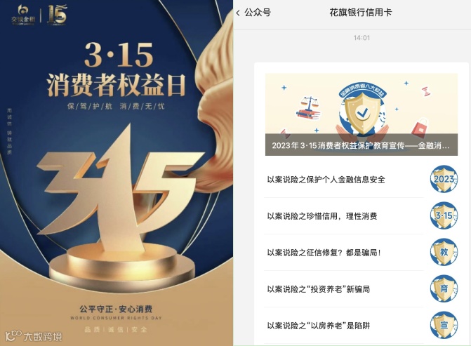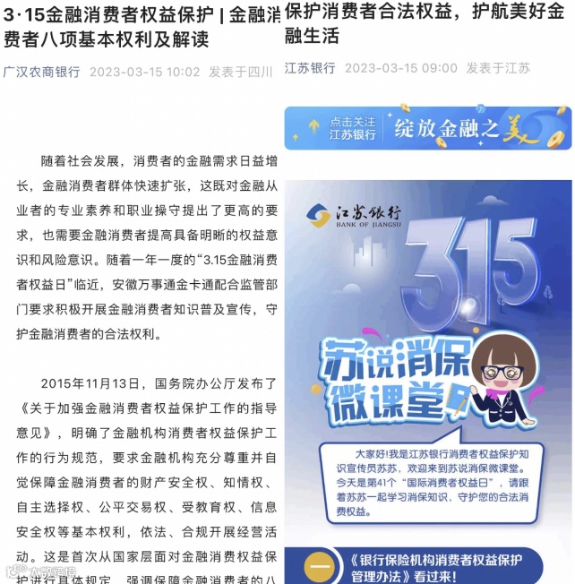 3月15日当日,证券时报·券商中国记者从线上线下多个渠道发现,来自交通银行、浙商银行、汇丰村镇银行、花旗银行、江苏银行、南银法巴消费金融和中银消费金融等机构在内的消保宣传内容传播广泛。