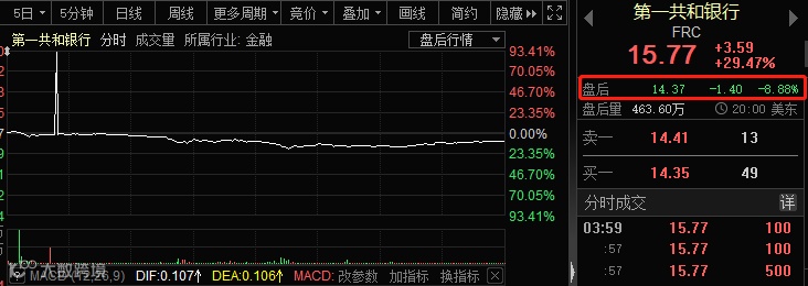 第一共和银行(FRC.US) 昨晚(21日)股价大涨近30%,但盘后又狂跌9%。据《彭博通讯社》引述消息人士报道,华尔街大行及美国官员正在讨论该行的救助计划,或有可能需要华府的介入。