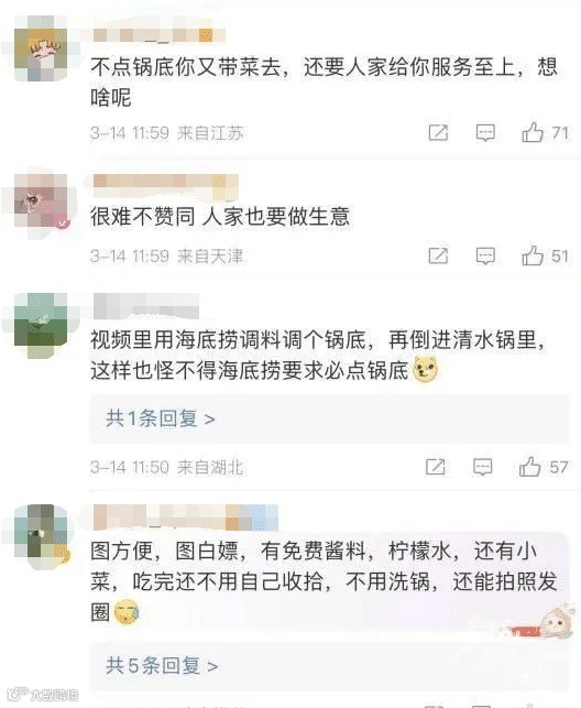 3月14日,#海底捞要求必须点锅底#登顶微博热搜榜。