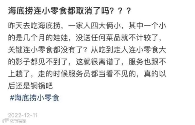 记者还注意到,也有不少网友在微博、小红书等社交平台上“吐槽”,表示海底捞不再主动送上小零食等。