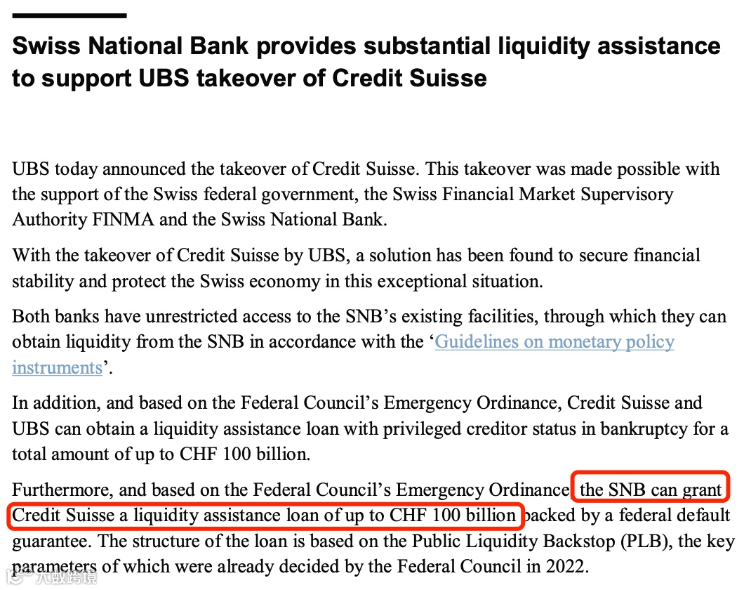 瑞士央行也同步发布声明,将提供大量流动性援助,支持瑞银收购瑞士信贷,包括为瑞士信贷提供高达1000亿瑞郎的流动性援助贷款,以及联邦违约担保。