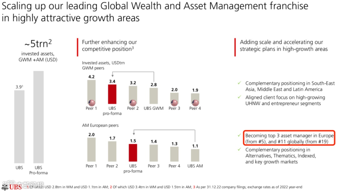 “此次合并将创建一个拥有5万亿美元(约34.48万亿人民币)投资资产的全球领先财富管理机构。”瑞银称,预计收购后新实体的投资资产规模会从2.8万亿美元增加至3.4万亿美元,并成为欧洲第三大资产管理机构(全球第11大),资管规模从1.1万亿美元提升至1.5万亿美元。