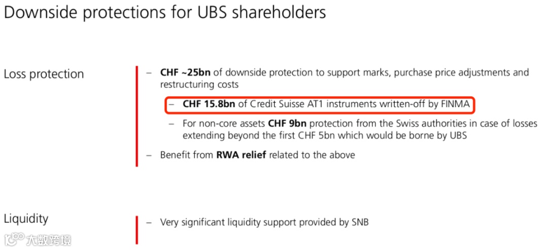 瑞银透露,在这笔交易中,其将获得250亿瑞郎的下行保护,保护从交易到按市价计算的资产价值,收购价格调整和重组成本,以及额外50%的非核心资产下行保护。两家银行也可不受限制地使用瑞士央行的现有工具,以从瑞士央行获得流动性。