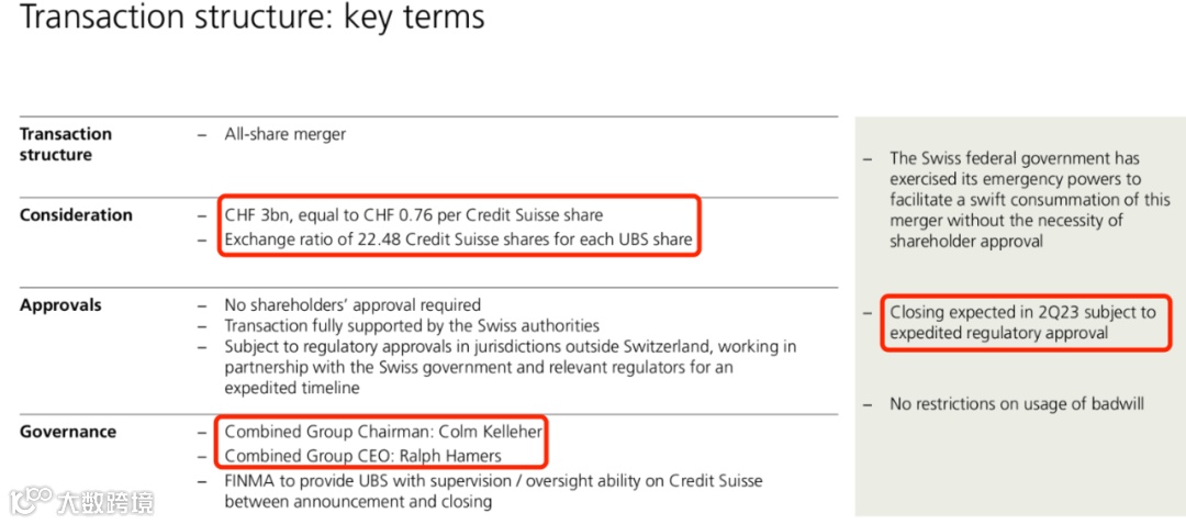 由于该交易无需获得股东批准,瑞银业已获得瑞士金融市场监管局(FINMA)、瑞士央行、瑞士联邦财政部和其他核心监管机构的预先协议,并得到及时交易批复,这笔交易有望在今年二季度火速完成。