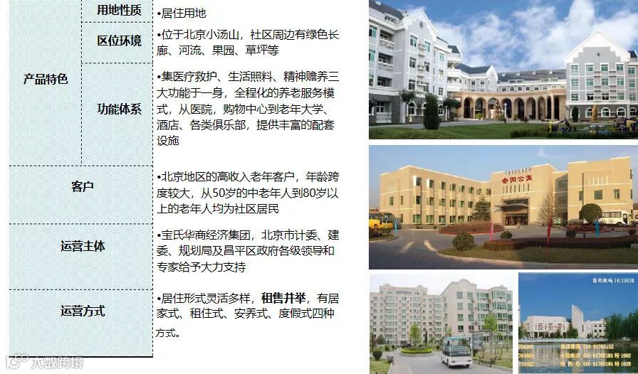 ③功能体系:大型综合养老社区,包括住宅、购物中心、老年大学、酒店、医院、康体娱乐等多种业态,提供满足居住、休闲娱乐、学习交流、亲子、医疗护理、康体养生等需求的丰富多元配套设施