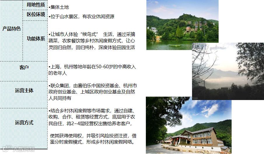 ⑥运营方式:出租或销售使用权:在乡村景区周边利用农村闲置资源建设度假物业,并将该物业一定年限的使用权销售给城市养老客户