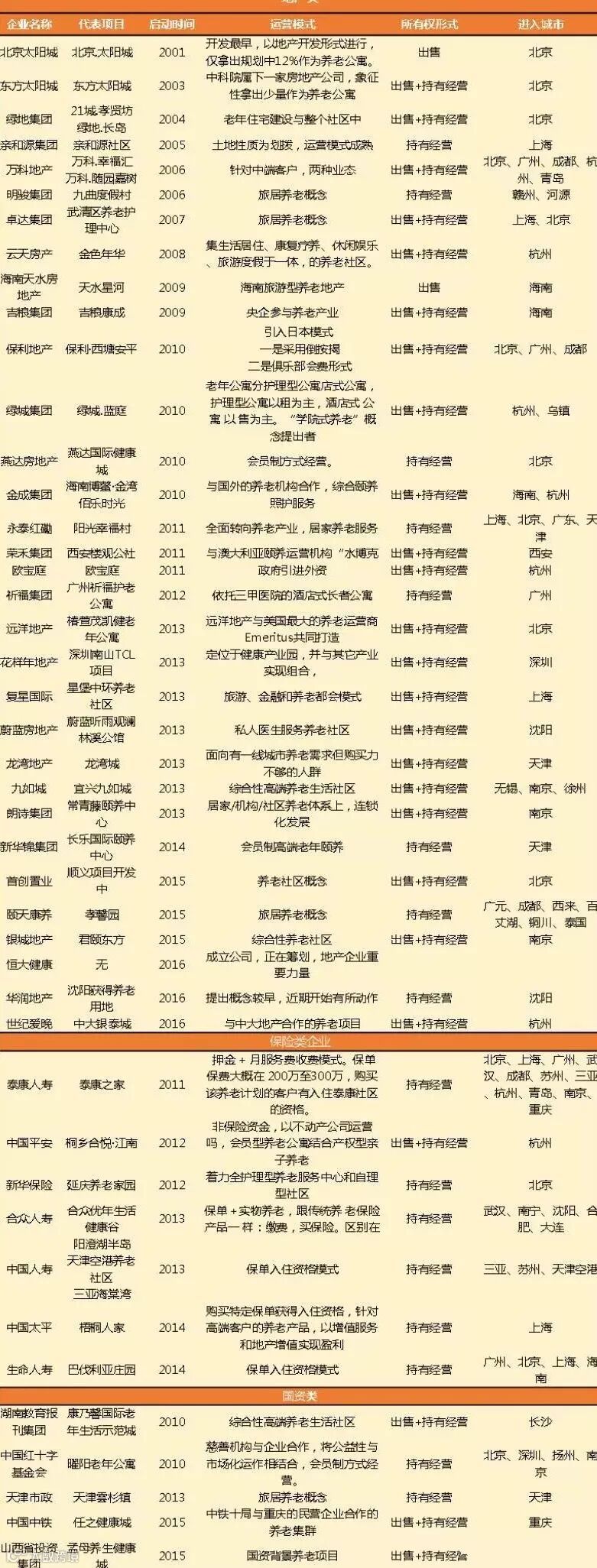 康养地产的主要参与机构被分为三大类:一类是实力雄厚,经验丰富的房企,如万科、保利、复兴、绿地等;二是手握大量资金的保险机构:如国寿、康泰人寿、生命人寿等;三是寻求产业布局或收益项目的社会资本:如红杉、云峰、和谐等。