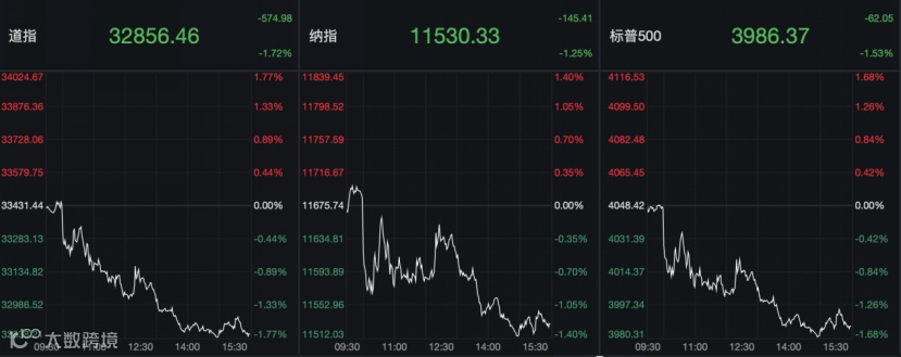 话音落地后,美股三大指数直线跳水,一路走低,道琼斯指数盘中最大跌近600点;截至收盘,道指大跌1.72%,纳指跌1.25%,标普500指数跌1.53%。其中,美股科技巨头亦集体跳水,特斯拉大跌超3%,苹果、微软、谷歌均跌超1%,明星中概股也跟随大势走低。