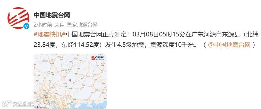 今日凌晨,广东河源突发地震,据中国地震台网正式测定:03月08日05时15分在广东河源市东源县(北纬23.84度,东经114.52度)发生4.5级左右地震,震源深度10千米。据中国地震台网速报最新消息,此次震中位于新丰江水库,距河源市市区21公里,距广州市150公里。地震造成当地震感强烈,广州、深圳等地有感,无破发发生。