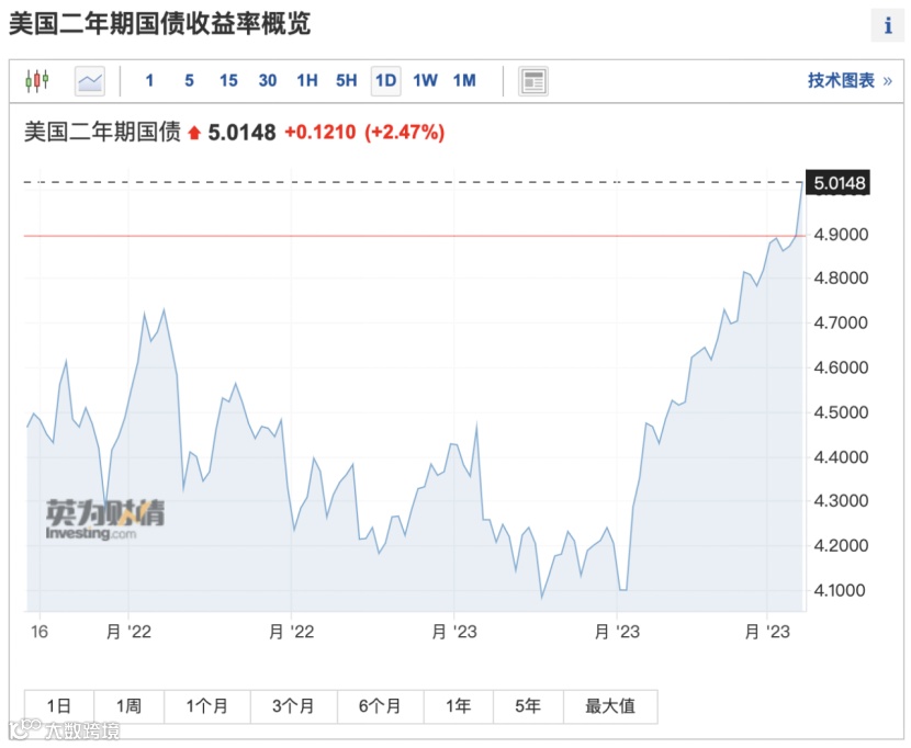 美国国债市场已经发出预警信号。受鲍威尔讲话刺激,2年期美债收益率涨11.2个基点报5.013%,创2007年以来新高。这也使得美国2年期国债收益率自1981年以来首次较10年期国债收益率高逾100个基点。