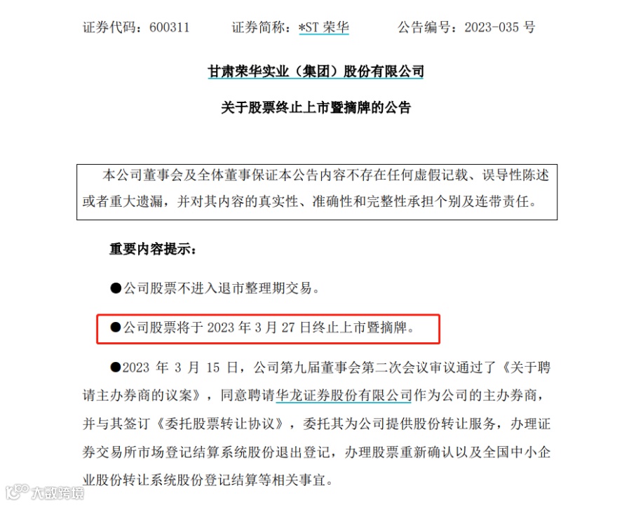 3月20日,*ST荣华发布公告称,公司股票将于2023年3月27日终止上市暨摘牌。公司股票不进入退市整理期交易。