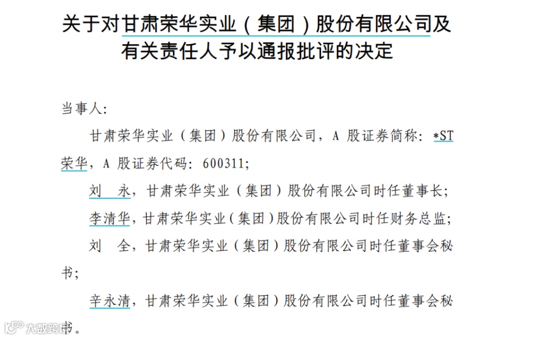 鉴于此,上交所作出如下纪律处分决定:对甘肃荣华实业(集团)股份有限公司和时任董事长刘永、时任财务总监李清华、时任董事会秘书刘全、时任董事会秘书辛永清予以通报批评。
