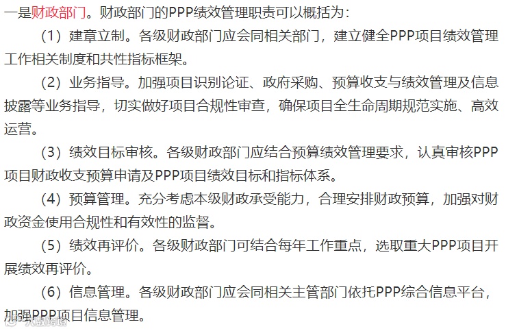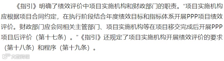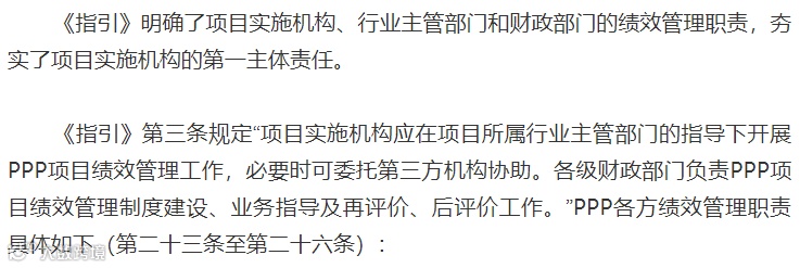 《指引》对绩效目标设定、审核、争议解决等做出了明确的规定。“项目实施机构负责编制PPP项目绩效目标与绩效指标,报项目所属行业主管部门、财政部门审核。(第十七条)”