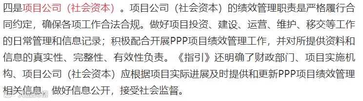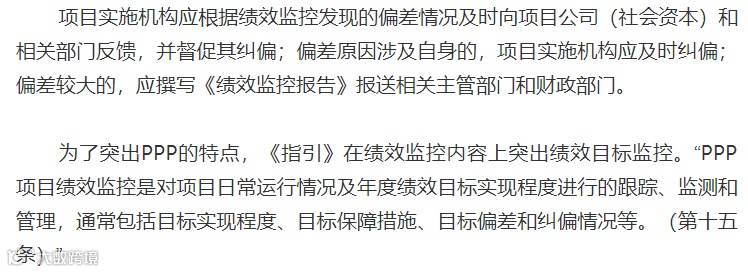 《指引》按照“谁支出,谁监控”的原则,明确了项目公司、项目实施机构在绩效监控中的主体责任。规定“项目实施机构应根据项目合同约定定期开展PPP项目绩效监控,项目公司(社会资本)负责日常绩效监控。