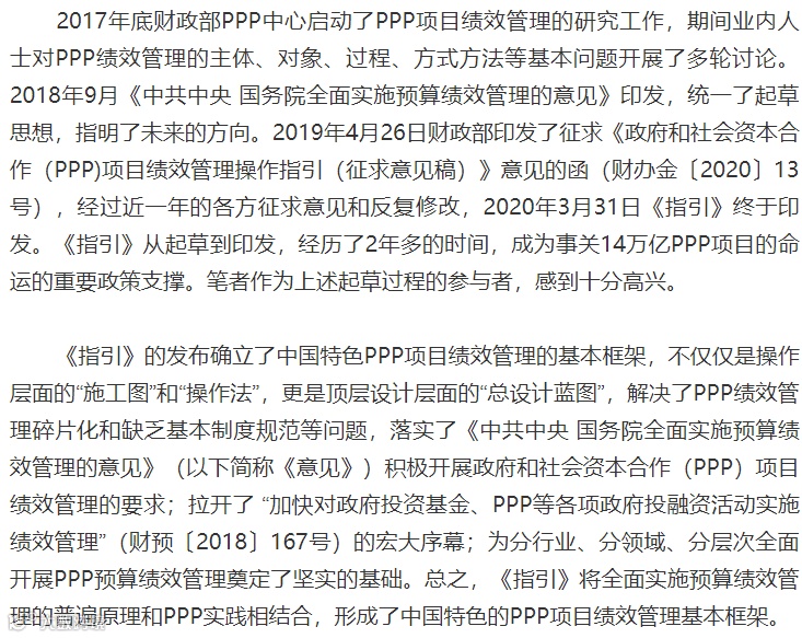 2020年3月31日《政府和社会资本合作(PPP)项目绩效管理操作指引》(以下简称《指引》)印发,并将在印发之日起30日后施行,这标志着中国特色的PPP项目绩效管理顶层设计和基本框架形成,将成为事关14万亿PPP项目的命运的又一重要政策支撑。