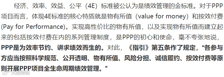 《指引》明确PPP项目绩效目标编制应该体现物有所值理念,体现成本效益的要求。