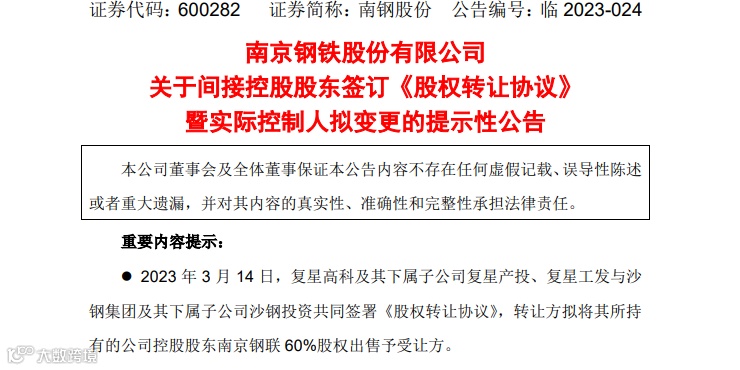 3月14日,南钢股份间接控股股东复星高科及其一致行动人复星产投、复星工发与沙钢集团及其全资子公司沙钢投资共同签署《关于南京南钢钢铁联合有限公司之股权转让协议》,约定复星高科、复星产投及复星工发拟向沙钢集团及沙钢投资转让所持有的南京钢联60%股权。