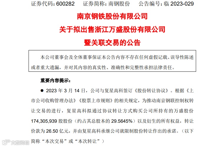3月14日晚间公告显示,为推动南京钢联控制权转让交易的进行,复星高科拟通过协议转让方式购买南钢股份所持有的万盛股份1.74亿股股份(约占其总股本的29.5645%)以及衍生的所有权益,转让价款为26.50亿元,并由复星高科承继公司就限制股份转让作出的承诺。