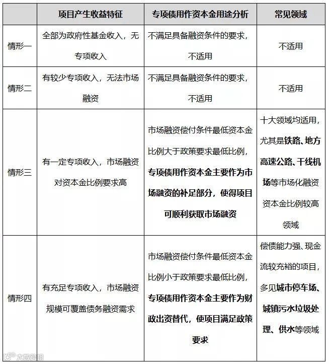 对于偿债能力强、现金流较充裕的项目,可能存在市场融资偿付条件最低资本金比例小于政策要求最低比例的情况,此时使用专项债作为资本金,主要作为财政出资替代,使项目满足政策要求。这种项目在城市停车场、城镇污水垃圾处理、供水等收益性特征较明显的领域更加多见。