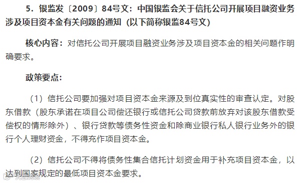 2009年,为了应对国际金融危机和国内需求萎缩等形势,采取有保有压的方式,促进结构调整和投资稳定增长,国务院进一步出台了调整不同行业的最低资本金比例(《国务院关于调整固定资产投资项目资本金比例的通知》国发〔2009〕27号),随即银监会发布了《固定资产贷款管理暂行办法》(中国银行业监督管理委员会令2009年第2号)、《中国银监会关于信托公司开展项目融资业务涉及项目资本金有关问题的通知》(银监发〔2009〕84号)等要求银行、信托等金融机构严格执行固定资产投资项目资本金制度的通知;