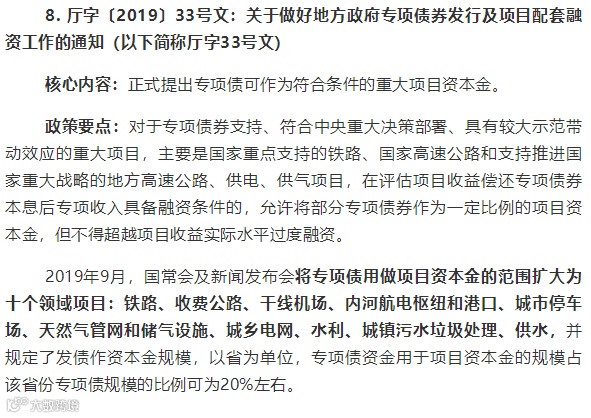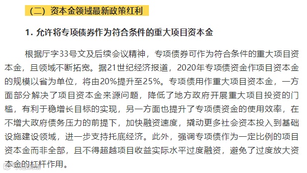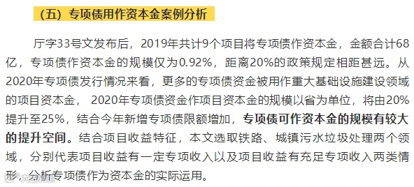 2020年,经济下行叠加突发疫情影响,财政政策成为短期内加强疫情防控、恢复生产、拉动投资的主要发力点。政府将坚持稳中求进工作总基调,加大“六稳”工作力度,在扩大实施减税降费等有效政策基础上,多措并举加大积极财政政策实施力度,最大程度减小疫情对宏观经济冲击。专项债作为近年来财政资金最大增量来源,将在拉动经济增长过程中发挥重要的杠杆效应。自2019年6月《关于做好地方政府专项债券发行及项目配套融资工作的通知》(厅字〔2019〕33号文,以下简称厅字33号文)提出允许将专项债作为符合条件的重大项目资本金以来,专项债可作资本金的范围已扩大到十大领域,可发债作资本金的规模比例也有所提升。在此背景下,本文将梳理资本金领域相关制度脉络,分析专项债用作资本金的政策红利。