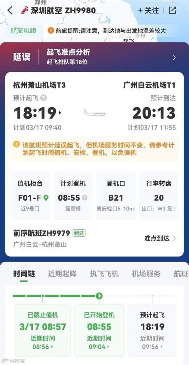 据悉,这趟航班ZH9980原计划于3月17日上午9时40分出发,11时55分抵达广州。航旅纵横客户端显示,航班于当天上午8时55分开始登机,但出现延误,预计起飞时间是下午6时19分。