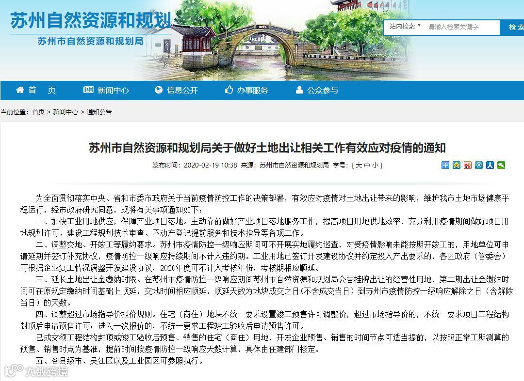 2月19日,苏州市自然资源和规划局网站发布了《关于做好土地出让相关工作有效应对疫情的通知》(简称“《通知》”)。
