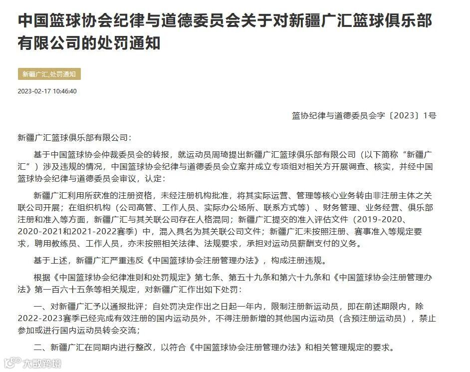 一是对新疆广汇予以通报批评。自处罚决定作出之日起一年内,限制注册新运动员。即在前述期限内,除2022-2023赛季已经完成有效注册的国内运动员外,不得注册新增的其他国内运动员(含预注册运动员),禁止参加或进行国内运动员转会交流。
