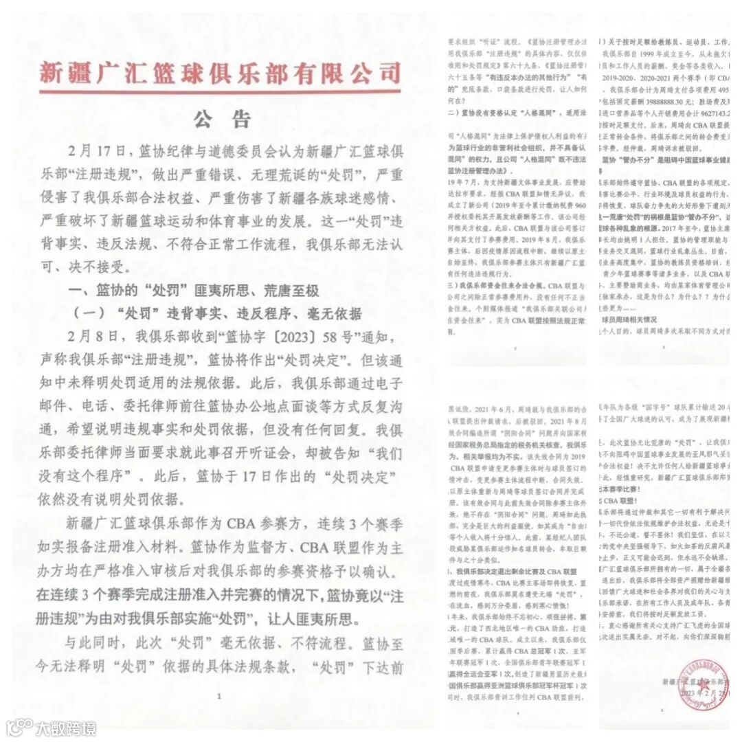 处罚公布后,2月18日上午,新疆广汇篮球俱乐部发布声明,回应此前中国篮球协会认定新疆男篮构成注册违规一事。回应中明确表态,新疆广汇篮球俱乐部并未违反《中国篮球协会注册管理办法》,并要求中国篮球协会撤回处理决定。